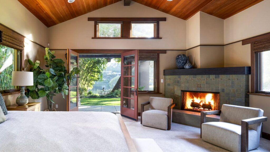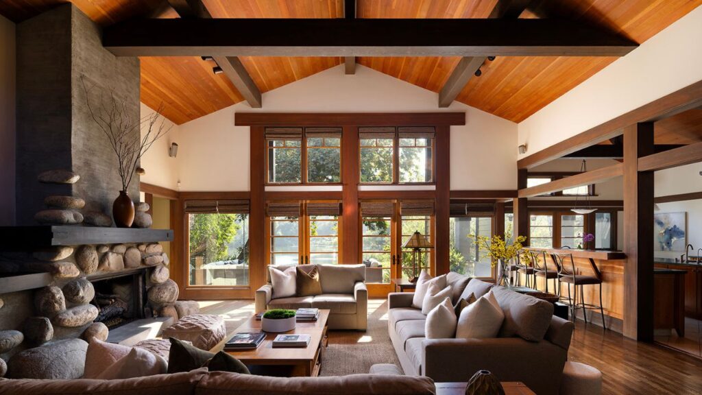Inside, an 18-foot (5.5-metre) beamed great room forms the heart of the home, featuring a substantial stone fireplace and a full-height wall of glass capturing uninterrupted lake views. Construction incorporates hand-hewn beams, reclaimed timber and stonework by the same artisans involved in restoring Pasadena’s iconic Gamble House.