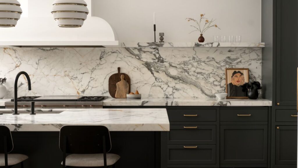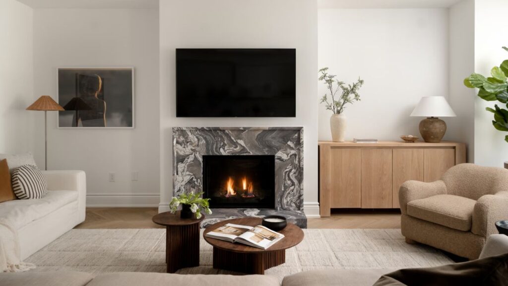 The redesign introduced contemporary elements to the classic interiors, with bold marble and stone accents featuring throughout the kitchen, bathrooms and around the home’s fireplaces.