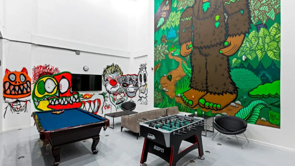The current listing, held by Craig Strong of Compass, shows the interior remains heavily decorated with street art-style murals, including a floor-to-ceiling forest character in the game room, painted figures around the kitchen, and a Sonic the Hedgehog mural near the staircase.