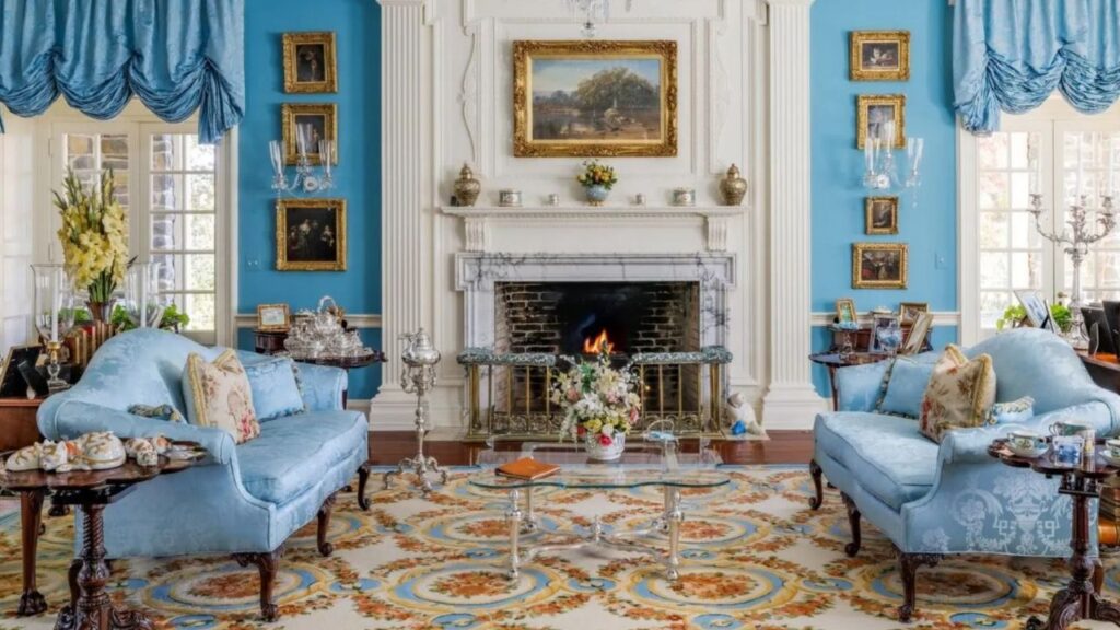 She replaced part of the house with a glass-walled conservatory shipped from England and restored twelve of the home’s thirteen fireplaces.