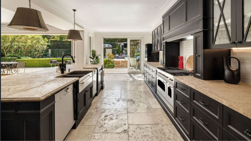 The property sits on a 784-square-meter block and features heated limestone floors, multiple living areas, and a Mediterranean-style kitchen.