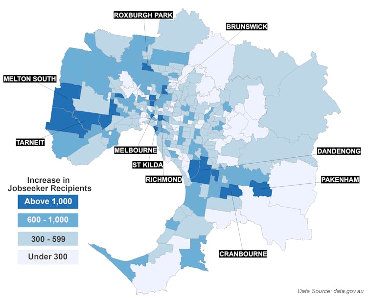 In Melbourne increases in unemployment are concentrated in inner-city suburbs like Brunswick and St Kilda. This reflects the loss of jobs for young people in hospitality and retail.
