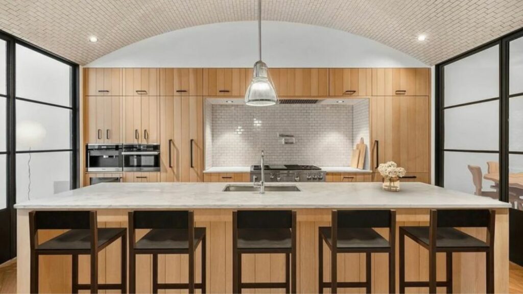 The gourmet kitchen showcases a substantial island bench, white-oak cabinetry, and exquisite honed marble countertops.