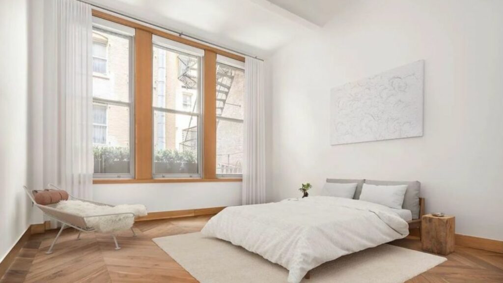 Notable features of this apartment include 13-foot ceilings, original cast-iron columns, and stunning walnut, chevron-patterned flooring.