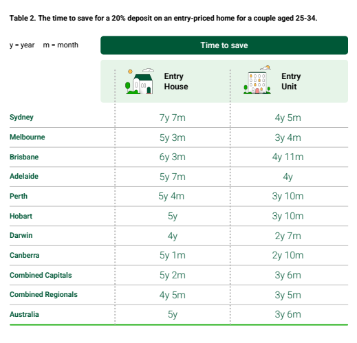 Darwin remains the most accessible market, with entry-level unit deposits achievable in two years and seven months – though even that timeline has increased by five months over the past year.