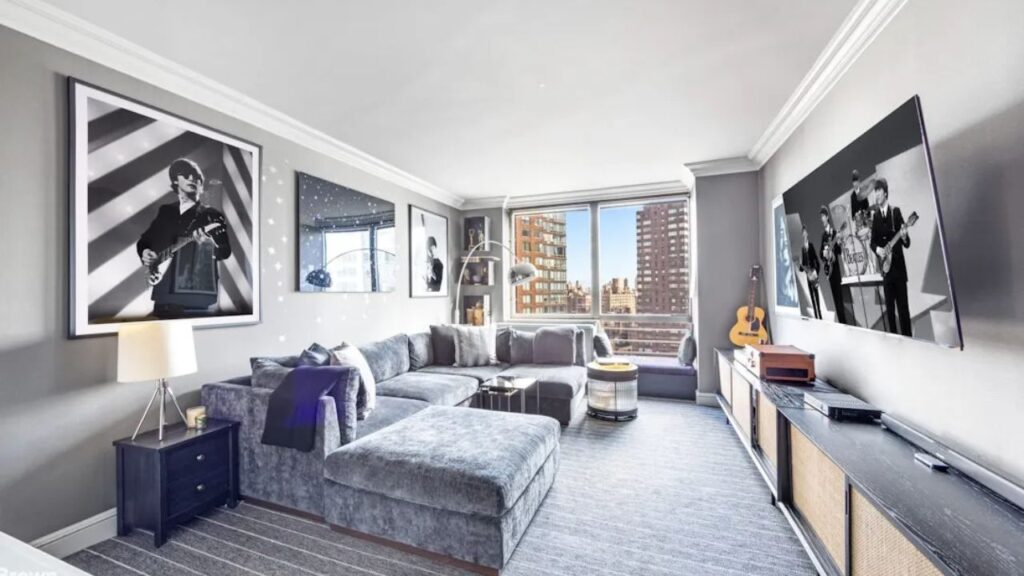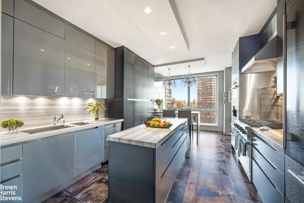 The four-bedroom, three-and-a-half-bathroom residence spans approximately 3,200 square feet at the Grand Millennium, a 32-storey tower at Broadway and West 66th Street developed by Millennium Partners in 1996.