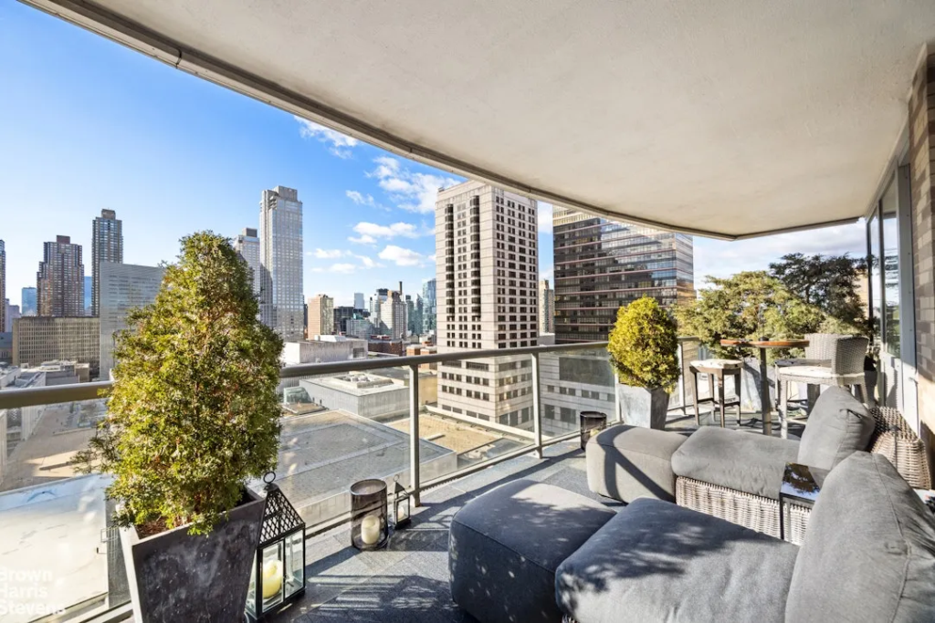 The residence features a 30-foot living room with three exposures and floor-to-ceiling windows, opening onto a 200-square-foot private terrace – a rarity in Manhattan.