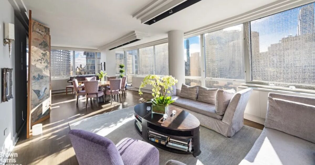 The four-bedroom, three-and-a-half-bathroom residence spans approximately 3,200 square feet at the Grand Millennium, a 32-storey tower at Broadway and West 66th Street developed by Millennium Partners in 1996.