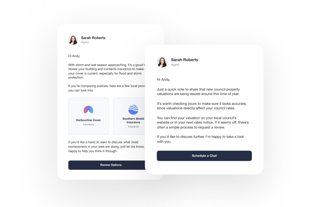 These can include things like council rate reminders, maintenance alerts, storm preparation guidance and insurance renewal prompts, all personalised to the property and timed to when it’s most relevant.