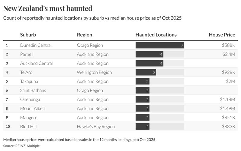 The analysis also revealed geographic concentrations of paranormal activity, with Dunedin Central emerging as the most haunted suburb in New Zealand.