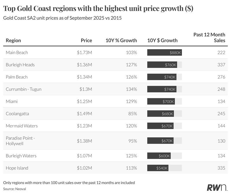“Main Beach now leads the city, with a median unit price of $1.73 million following a $880,000 rise over the past decade,” she said.