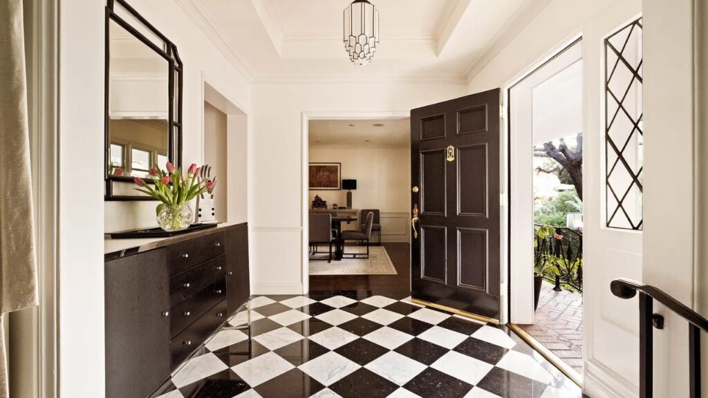 The classic black and white marble foyer opens to a living room with a large bay window, crown mouldings and an antique French marble fireplace.