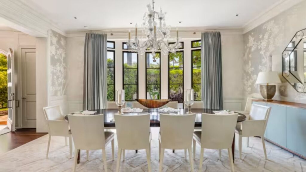Barbara Goldner invested millions in the redesign, adding luxury details throughout the property including a Calacatta Viola marble fireplace, hand-painted Gracie wallpaper, and a 19th-century Spanish crystal chandelier.