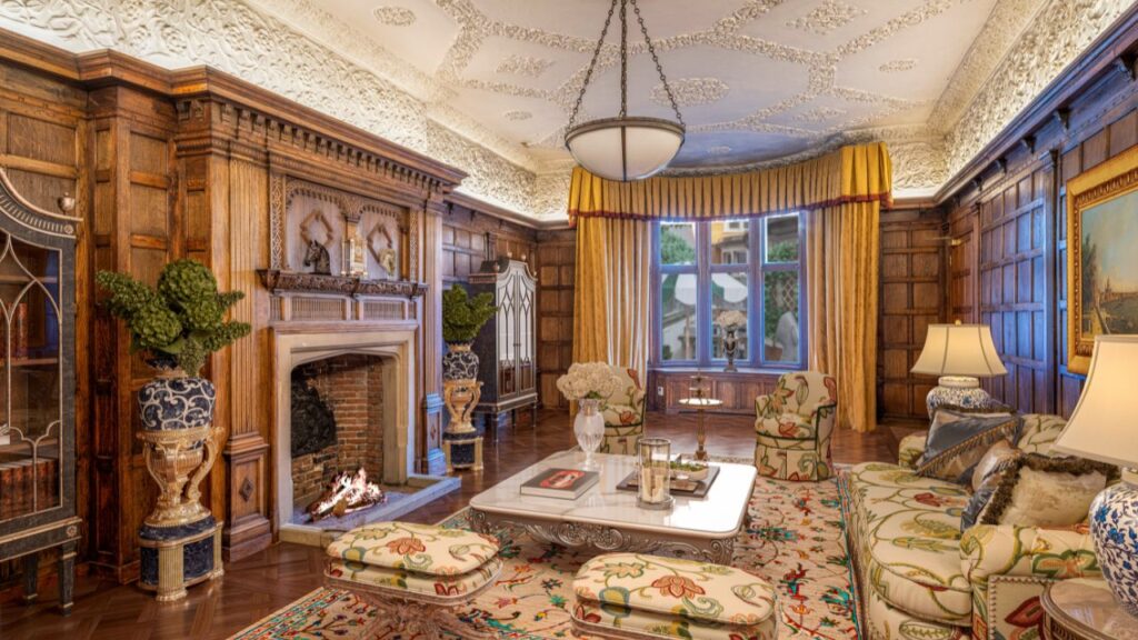The five-storey mansion features a Tudor-style Portland stone façade with bay windows and a gable bearing the Auchincloss-Coats family crest.