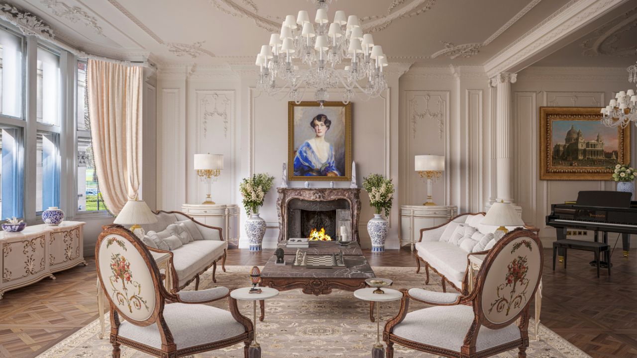 The Grade II Listed Edwardian mansion-townhouse at 26 Upper Brook Street offers views of Hyde Park and provides almost 13,928 square feet of palatial accommodation, including a central courtyard garden and a mews house to the rear.