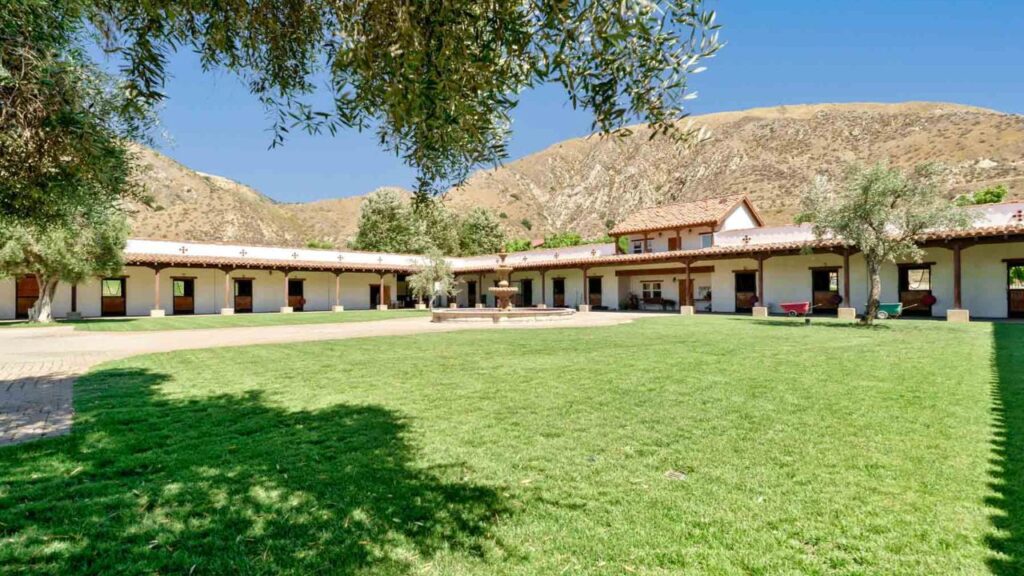 The property boasts approximately 600 acres of irrigated agricultural land with lemon and avocado orchards, extensive equestrian facilities including an 18-stall main barn, and an events venue used for weddings and charity functions.
