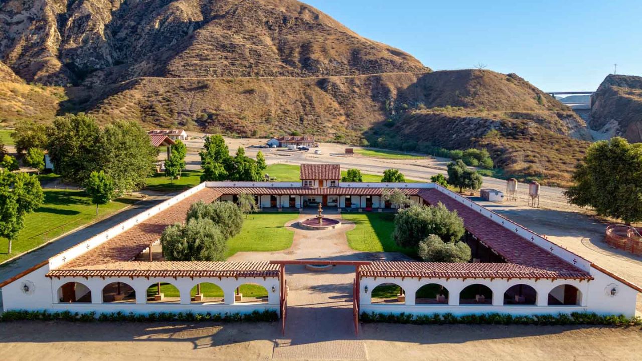 The property boasts approximately 600 acres of irrigated agricultural land with lemon and avocado orchards, extensive equestrian facilities including an 18-stall main barn, and an events venue used for weddings and charity functions.