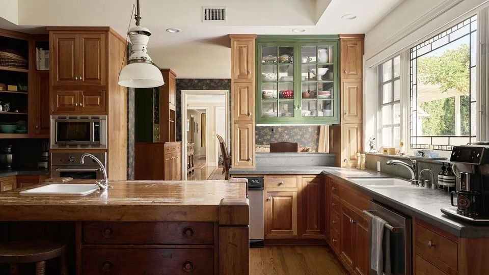 Highlights of the home include a kitchen designed for everyday living, featuring a central island, open shelving, and a breakfast banquette with garden views.