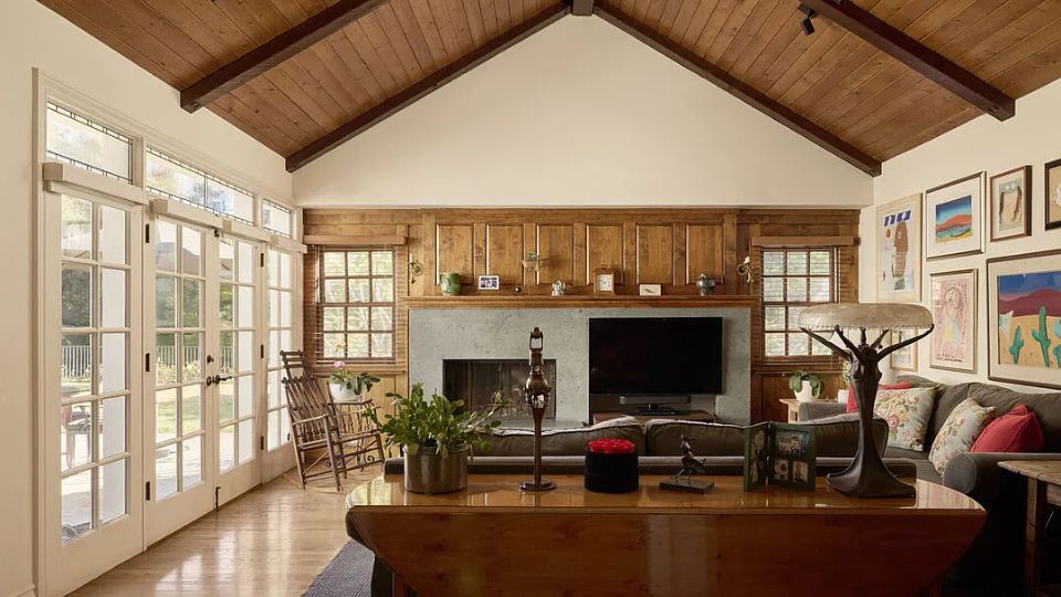 The adjoining family room reflects the home’s inviting character, with vaulted timber ceilings, a stone fireplace, and French doors opening to the backyard.