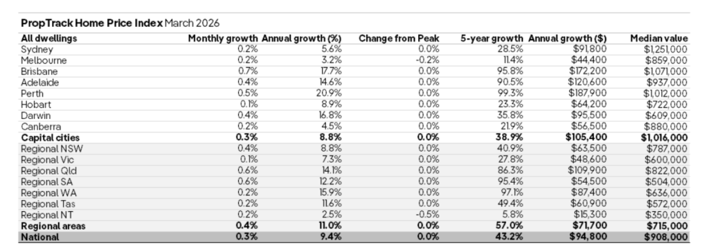 More than three-quarters of SA4 regions recorded weaker monthly growth compared to February, signalling what PropTrack describes as “a clear turning point in the cycle” as rising interest rates weigh on the market.