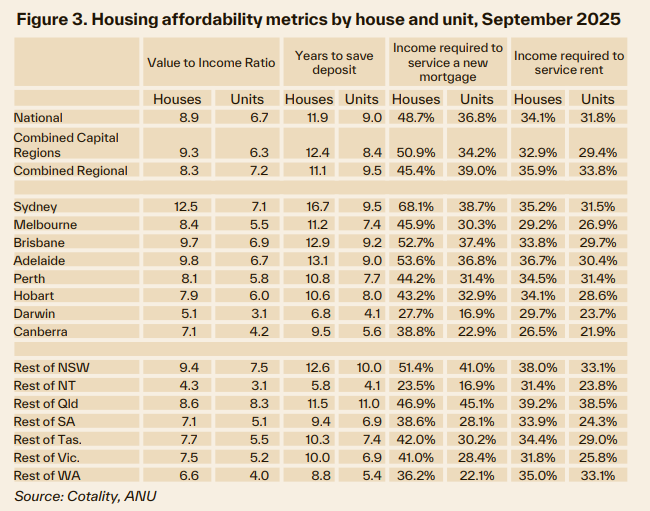 Sydney remains Australia’s most expensive and unaffordable city, where the median dwelling value is 10 times the median household income, requiring 54.5 per cent of income to service a new mortgage.