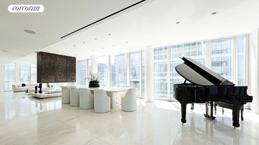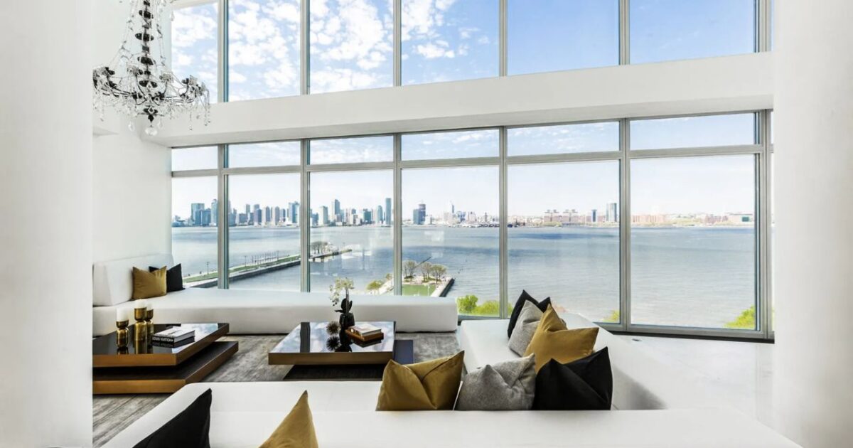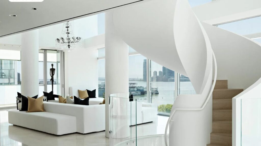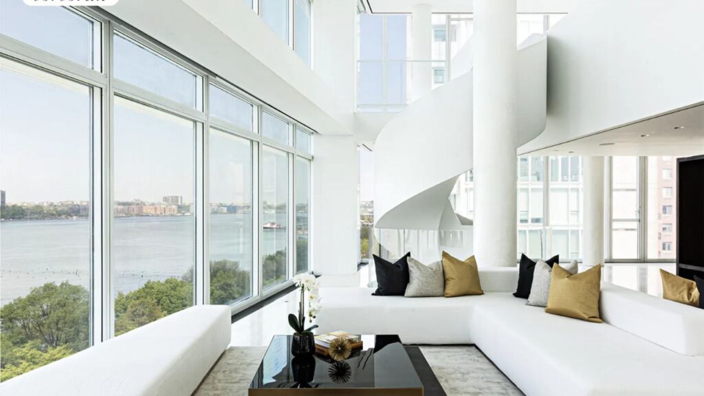 The five-bedroom triplex on Perry Street, designed by acclaimed architect Richard Meier, spans 11,000 square feet and features a double-height living room with Hudson River views.
