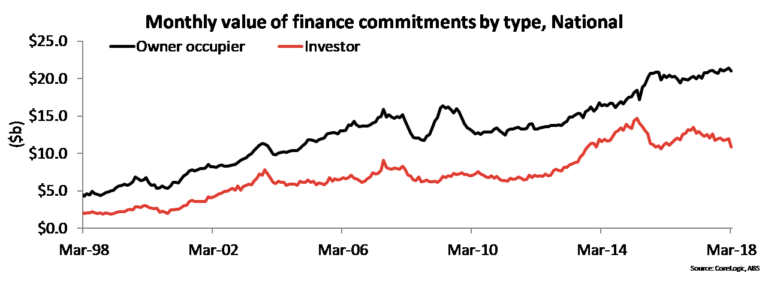 In March 2018 there was $31.9 billion worth of housing finance commitments which was the lowest monthly value of commitments since August 2016. Housing finance commitments were split between $21.0 billion to owner occupiers and $10.9 billion to investors. Owner occupier commitments fell by -1.9% over the month to their lowest value since December 2017. Investor finance commitments were down by -9.0% over the month, falling to their lowest value since January 2016. The declining trend in investor housing finance commitments had slowed recently, however, the -9.0% monthly fall was the largest decline since September 2015 when they fell -10.4% over the month as lenders tightened in order to remain under the 10% APRA speed limit in annualised terms.