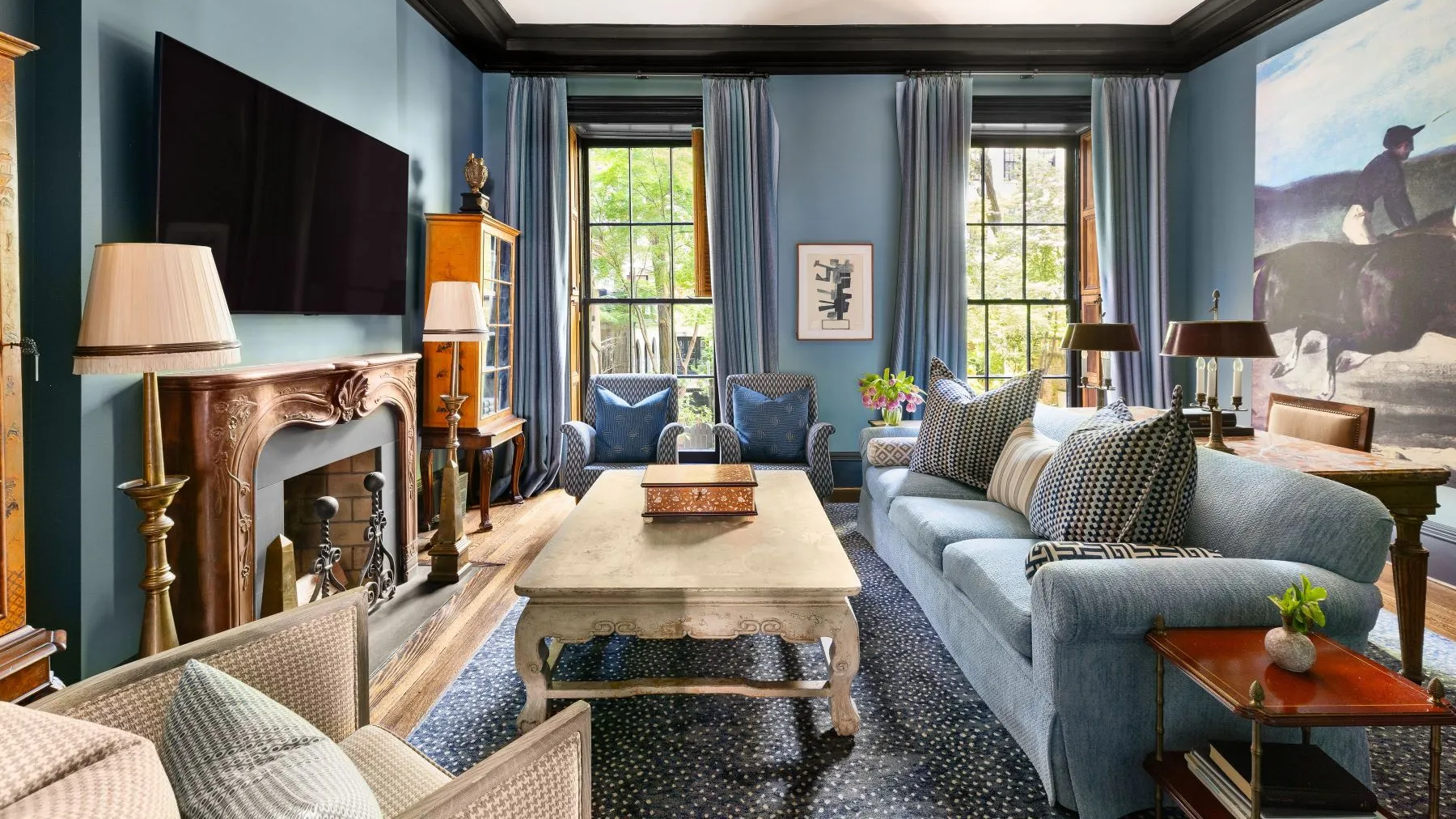 The primary suite includes its own wood-burning fireplace, high ceilings, and a bathroom with a claw-foot soaking tub.