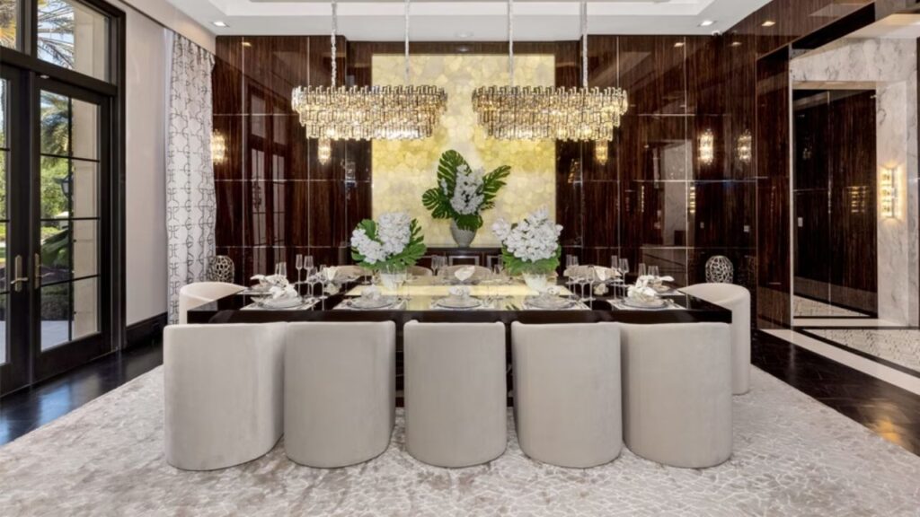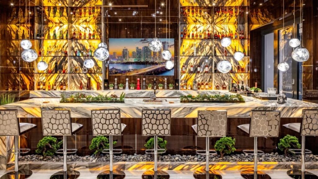 Luxury details abound throughout the residence, including custom-designed crystal chandeliers and a hidden cigar lounge with an advanced air-purification system. The property also includes a separate guesthouse for staff or visitors.