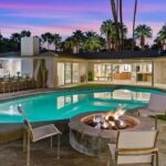 The home’s private outdoor space is designed for relaxation and entertainment, featuring a seated bar, a fire-pit conversation area, and a seasonal waterfall.