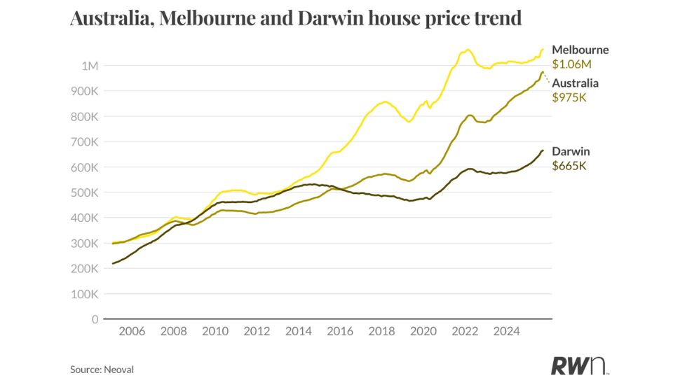 Melbourneโs median house price now sits around $1.06 million, while Darwinโs stands at $665,000; still below its 2014 peak but rapidly regaining lost ground.