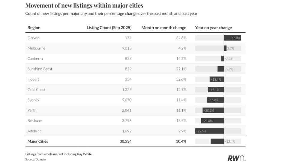 Listings data also show confidence returning, with Darwin up 62.6 per cent month-on-month and 16.8 per cent year-on-year, and Melbourne up 4.2 per cent over the month.