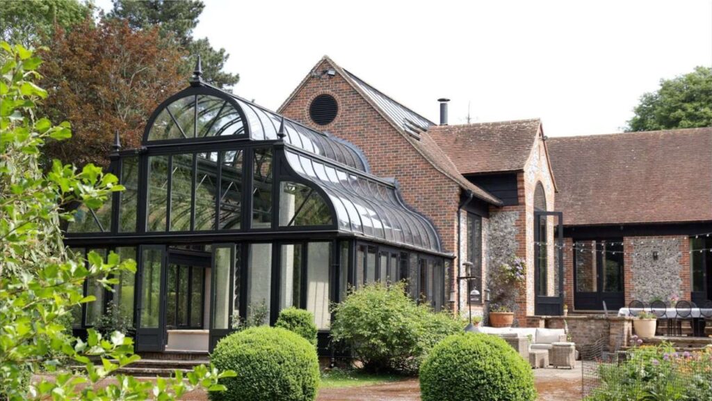 The property boasts an impressive array of leisure facilities, including an indoor swimming pool enclosed by a Victorian-style pavilion with a curved glass roof.