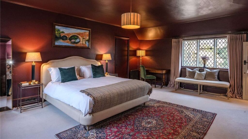 The original 17th-century section maintains period details, including stone fireplaces, wooden beams, and Gothic arches, while Mr Caine’s extension added contemporary living spaces.