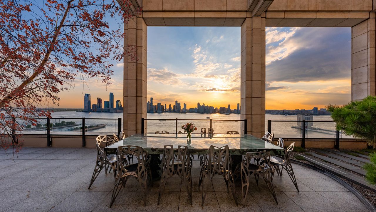 Set across two dramatic levels with abundant outdoor space and sweeping Hudson River views, the residence reflects the fashion executive’s flair for colour, texture and high-end detail.