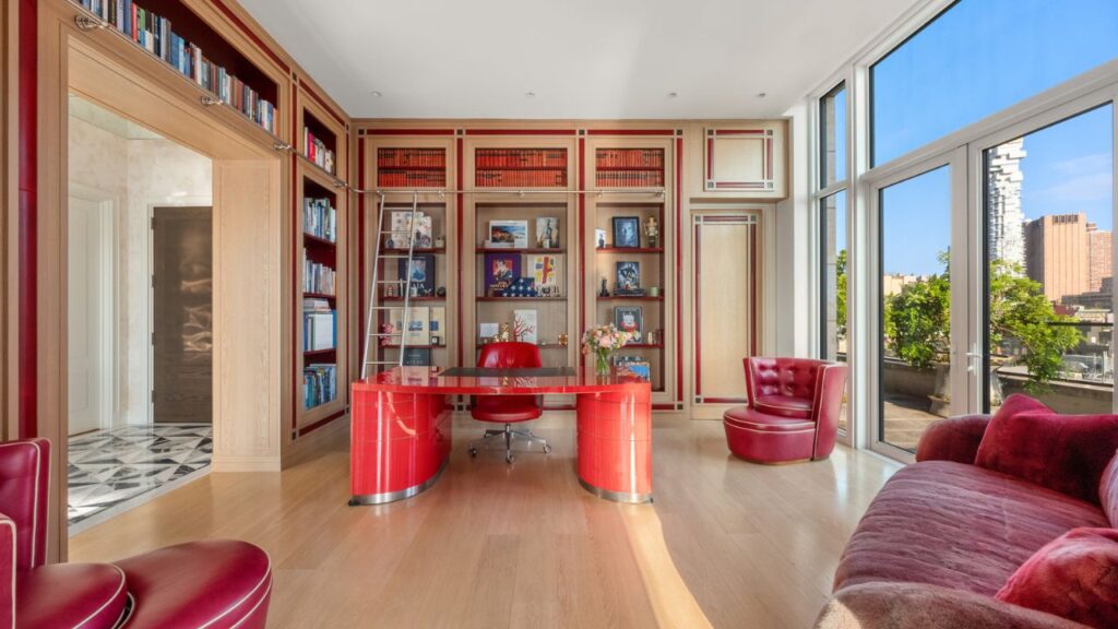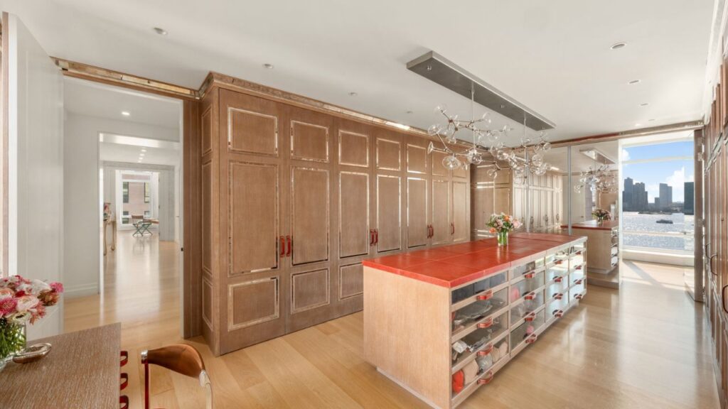 There are six bedrooms, six bathrooms, two powder rooms and two chef’s kitchens, all connected by a private lift. Floor-to-ceiling windows frame skyline and Hudson River views, while bespoke storage solutions run throughout the home.