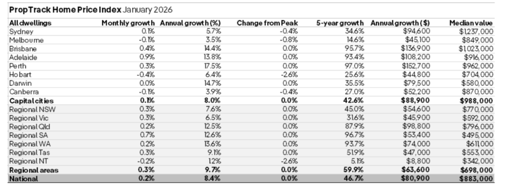 According to the latest PropTrack Home Price Index, national home prices increased by 0.2 per cent in January 2026, bringing the annual growth to 8.4 per cent.