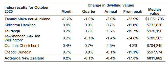 Wellington also presented a mixed picture in October. Wellington City itself saw a 0.5 per cent increase, while Lower Hutt fell by 0.4 per cent and Porirua declined by 0.2 per cent.