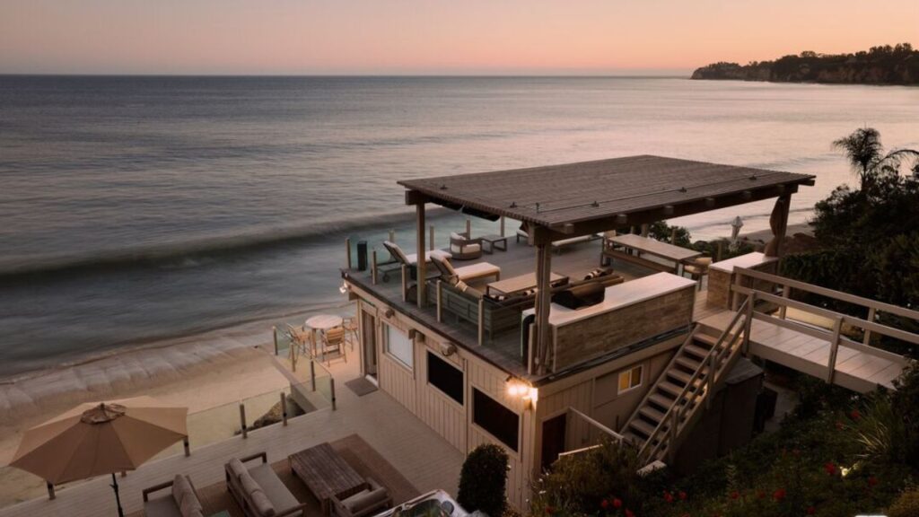 One of the property’s most distinctive features is a large cabana situated directly on the sand, complete with an extensive patio and rooftop designed for beachfront entertaining.
