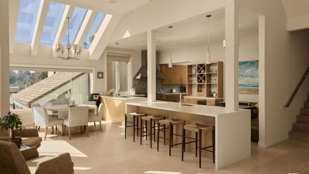 According to the listing, the multi-level home, constructed in 1982, offers four bedrooms and includes open-plan living spaces illuminated by a pitched skylight.