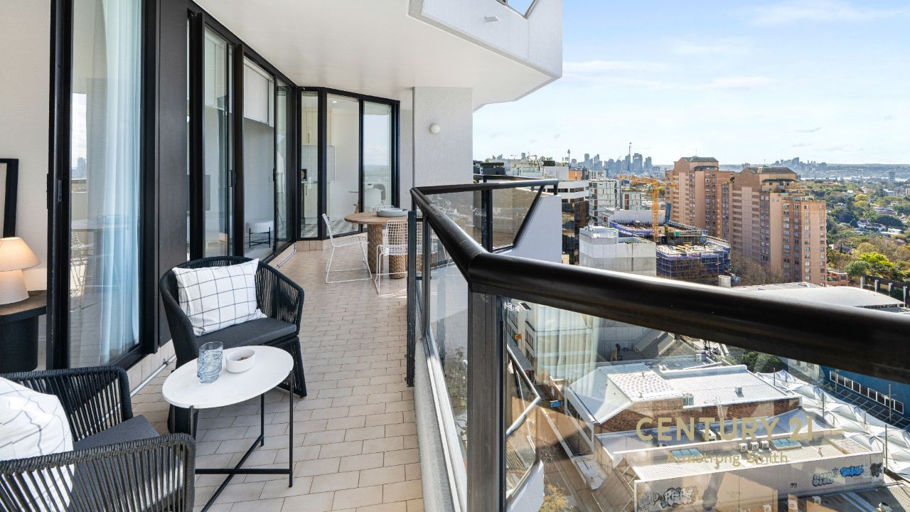The 19th-floor apartment features a 12-metre balcony spanning the full length of the residence, with northerly light and district views extending to the Harbour Bridge.