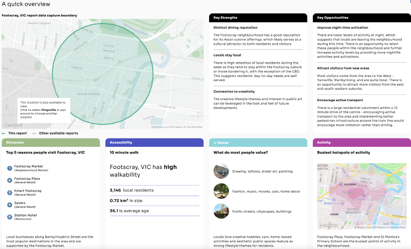 Founded in 2017, Neighbourlytics offers real-time lifestyle and mobility data, including foot traffic, visitor trends, lifestyle personas, top destinations, and accessibility, to paint an informed picture of how people live, move, and connect within communities.