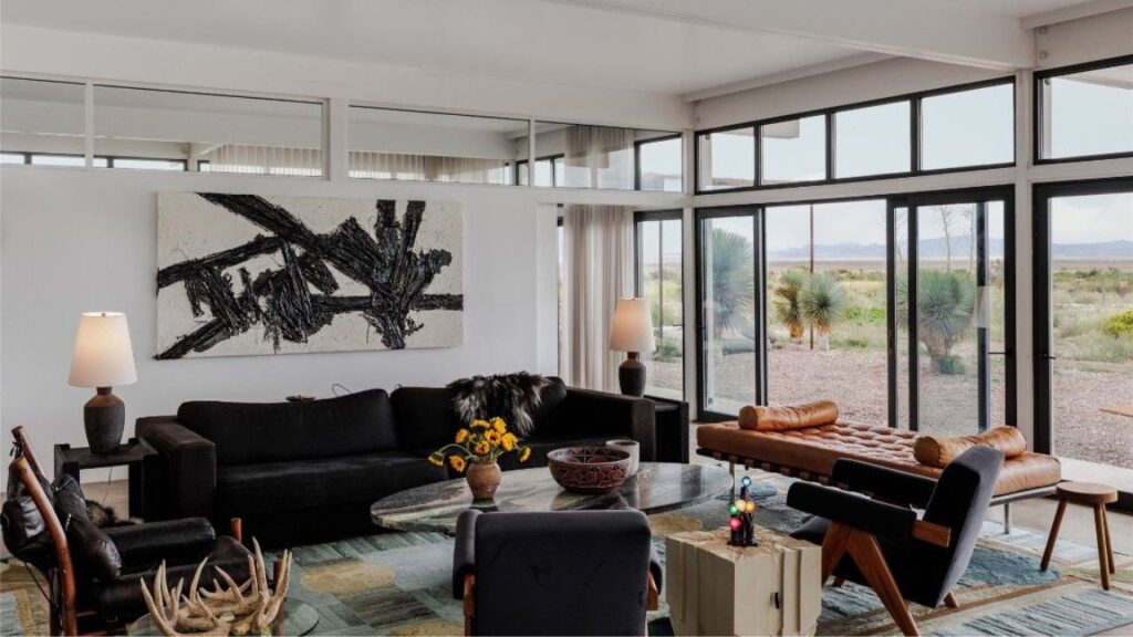 The living room is furnished with black hide Pierre Jeannerett armchairs and brown leather pillows, creating an inviting atmosphere.