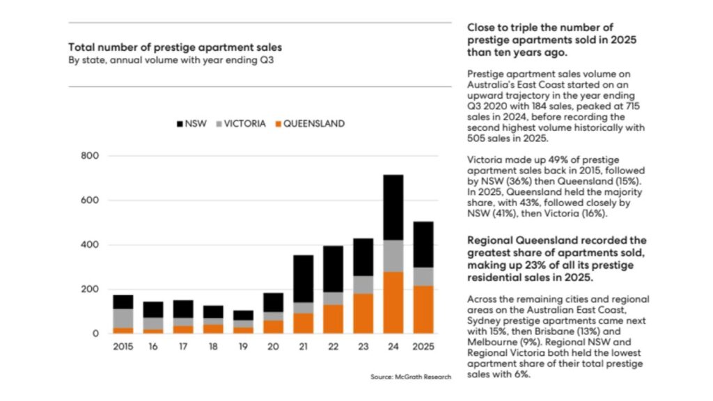 McGrath Research data reveals that the number of prestige apartments sold in 2025 has trebled over the past 10 years, signaling a sustained shift in buyer preferences.