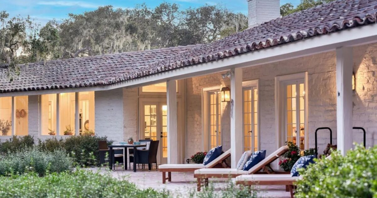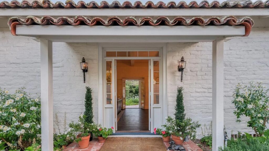 Built in 1940, the single-level home features a tile roof, white adobe walls and French doors opening to a loggia running the full length of the property.