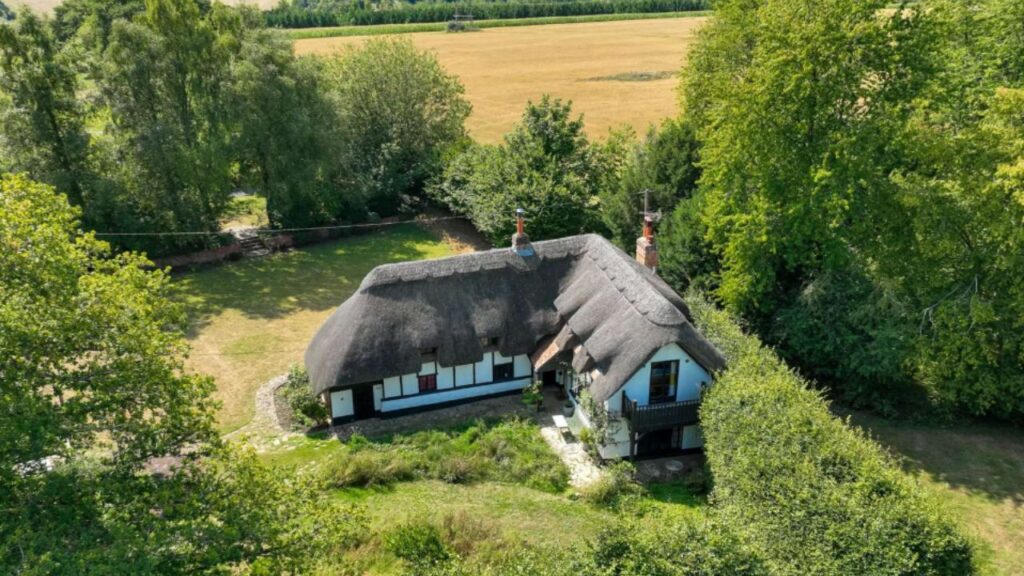 The cottage sits on 0.57 acres of land amid wildflower meadows in the hamlet of Toweridge, near West Wycombe, approximately two hours northeast of London.