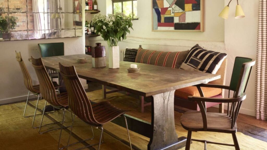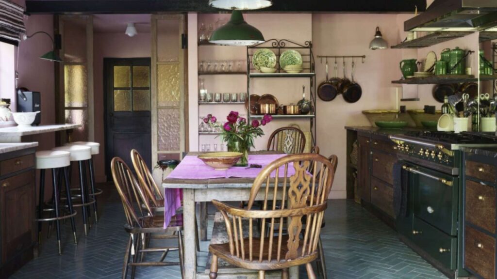 The renovation preserved original features, including exposed wooden beams, low ceilings, and open fireplaces, while introducing vibrant colours and patterns throughout.