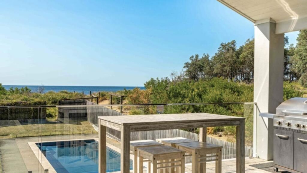 According to realestate.com.au, the luxury property features five bedrooms, three bathrooms, and an open-plan kitchen and dining area that extends to dual balconies overlooking the ocean.